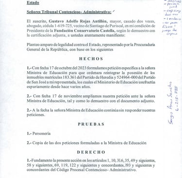 17 de Octubre de 2023 y 17 de Noviembre de 2023: Fechas en las que la Fundación realizó solicitudes formales al Ministerio de Educación Pública pidiendo el reintegro de posesión de dos inmuebles claves. La ausencia de respuesta a estas solicitudes desencadenó la presentación de la demanda.