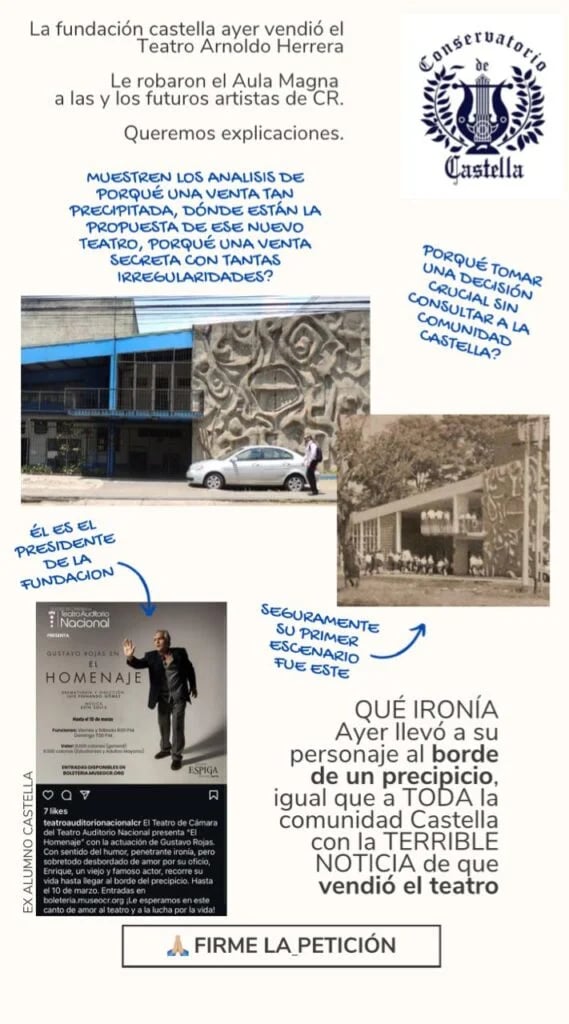 La operación se cerró por $3.5 millones, cifra destinada a la construcción de un nuevo teatro en Barreal de Heredia. Sin embargo, esta transacción ha generado dudas y temores sobre el futuro del arte y la educación artística en nuestra institución. Especialmente, porque contradice declaraciones previas de Rojas, quien en junio de 2023 afirmó no tener intenciones de vender, según el Semanario Universidad. Siete meses después, la venta se realizó sin previo aviso a la comunidad Castella, evidenciando una discrepancia entre palabras y acciones.