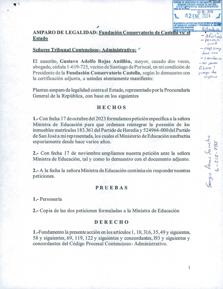 22 de Febrero de 2024, 8:08 AM: Este día y hora marcan el inicio formal del proceso, cuando se notificó a ambas partes, el Estado y la Fundación Conservatorio de Castella, sobre el amparo de legalidad. Esta notificación pone en marcha oficialmente el procedimiento judicial.